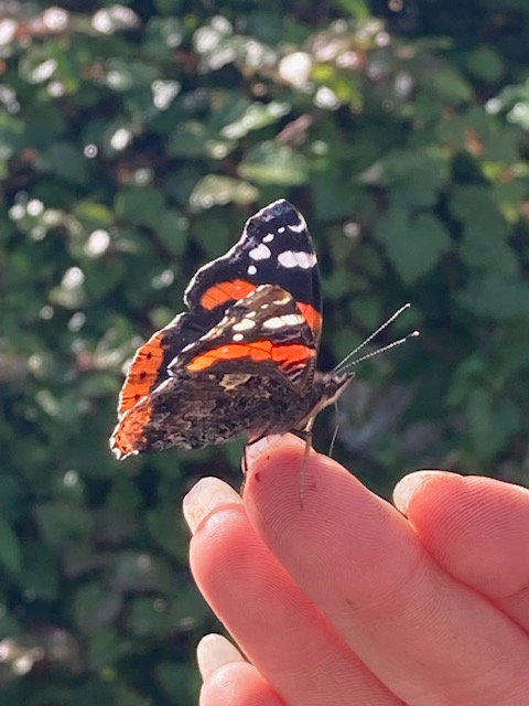 Many butterflies fluttered round the garden and to the soft fruit I put out for them. Caitlin made friends with a robin and we trained it to feed from our hands. She now comes daily and demands.